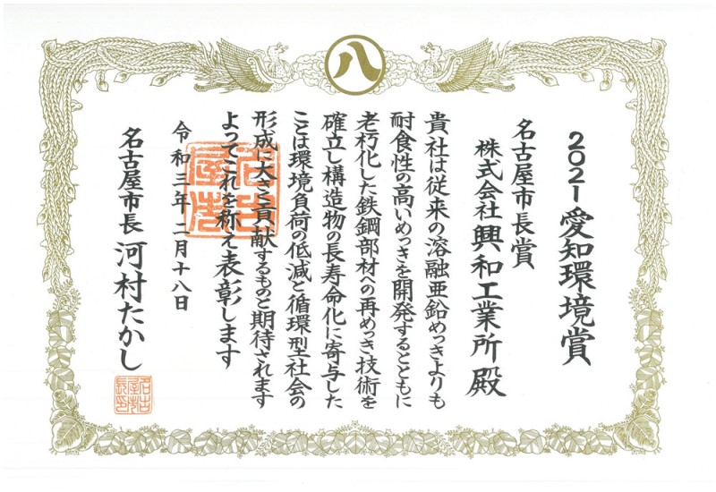 興和(山東)機(jī)械有限公司的日本本社株式會社興和工業(yè)所于2021年2月18日榮獲2021年度愛知縣環(huán)境保護(hù)獎。茲用來表彰株式會社興和工業(yè)所不同于一般的鍍鋅工藝,在研發(fā)使用高耐腐蝕性電鍍技術(shù)的同時,通過對老化鋼材的再電鍍技術(shù),實(shí)現(xiàn)了構(gòu)造物壽命的延長,對環(huán)境保護(hù)及構(gòu)建循環(huán)型社會做出了重大貢獻(xiàn)。